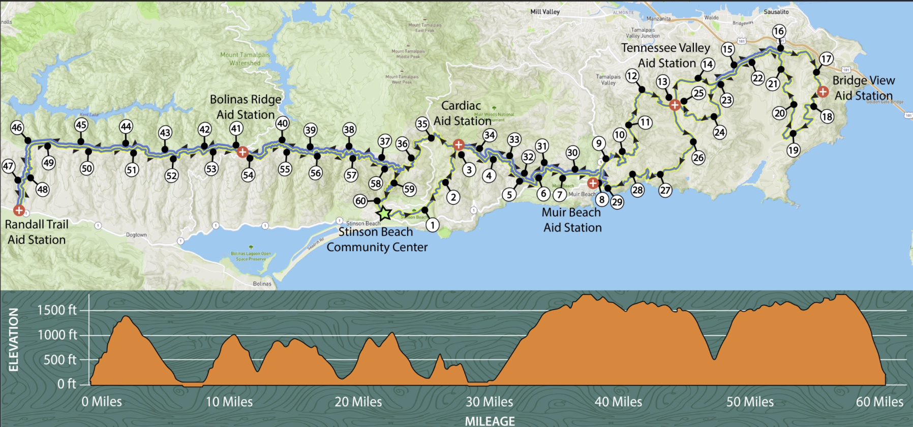 • Starting LineClick here for map showing race morning parking, check-in, and the start area at Stinson Beach Community Center. Signs on the front porch will indicate drop bag locations for Tennessee Valley, Randall, and Finish.